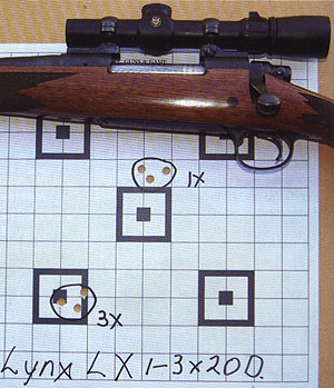 Arguably the ultimate low mounted scope. The scope is a Lynx LX 1-3x20D set in Leupold bases and Leupold Super Low Rings, I did have to remove a small amount of metal from the back of the rear base to allow the scope to go forward enough for correct eye relief. This rifle scope combination is absolutely terrific to use as it shoulders like a fine shotgun and my eye is looking directly through the scope. This low mounting is not possible if the ocular is any bigger than the 38mm of this Lynx, as there is only about .75mm clearance for the bolt handle and the 700 Remington has one of the best shaped bolt handles in the business. On the power change test target there does appear to be a slight change in the point of impact, but when you factor in that reticle on 1 power covers approximately 3" at 100 yards the change becomes insignificant. This test was done at 100 yards asare all scopetests unless stated otherwise. |